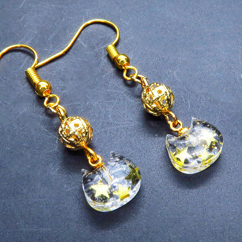 - クリアな猫フェイスモチーフとメタルビーズを組合せたピアス ゴールドカラー サージカル可