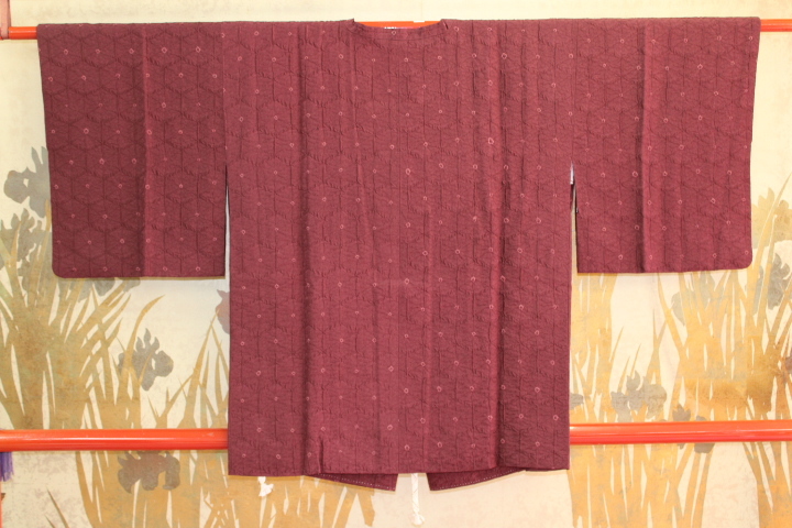 - きもの今昔6468 道行コートコレクション 正絹纐纈織(ふくれ織)麻の葉綸子模様に濃いエンジ色 絞り入り コート丈77cm