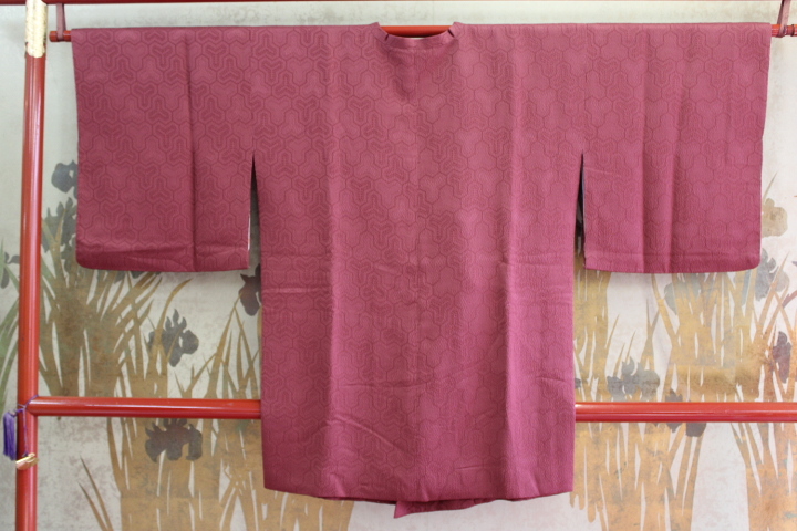 - きもの今昔6486 道行コートコレクション 正絹纐纈織毘沙門地紋膨れ織 濃いワイン赤色 コート丈87cm
