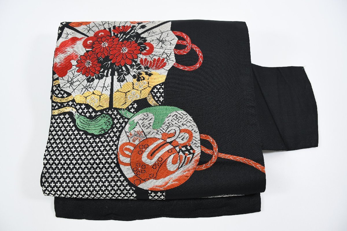 - 名古屋帯 アンティーク 黒 花 帯丈326cm ★着物屋 ne-7785 桜庭呉服店
