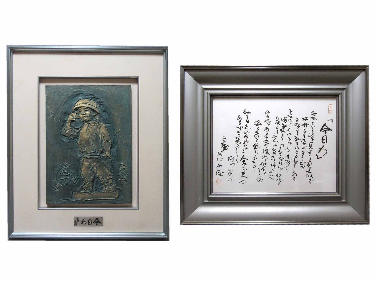 - レリーフ額と書額「今日わ」(模写)〈2点〉:(北村西望〈彫刻〉)/240201★