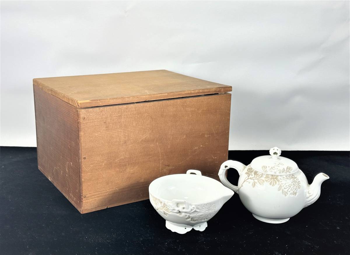 - E158●出石窯 白磁 花鳥彫刻 急須 湯冷 宝瓶 煎茶道具 茶道具 陶器 総重:約289g 現状品