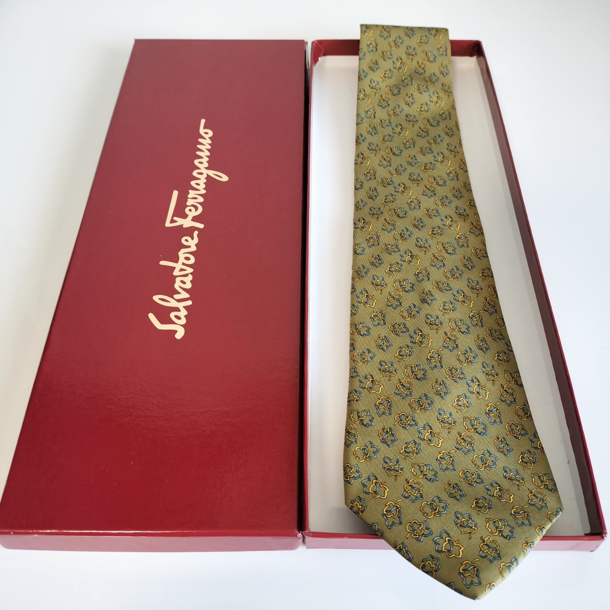 - Salvatore Ferragamo(サルヴァトーレフェラガモ)緑青黄色花びらネクタイ