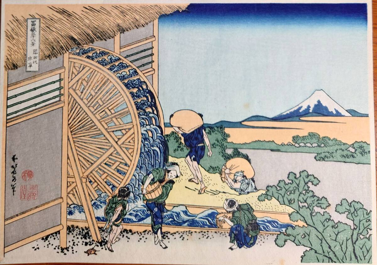 > f20240206033〇富嶽三十六景 葛飾北斎筆 隠田の水車 今の原宿 古法純手摺彩色木版画 世界的に有名な作品 東京国立博物館監修 昭和年代