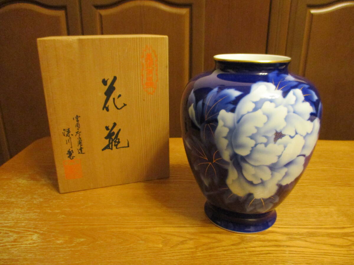 - 宮内庁御用達【深川製磁】金彩 瑠璃牡丹 花器 木箱付