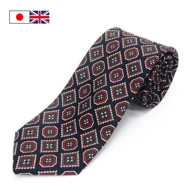 - 英国ADAMLEY生地使用/京都産 プリントネクタイ ネイビー×レッド 大柄小紋 シルク100% 日本製 KV-ADM01