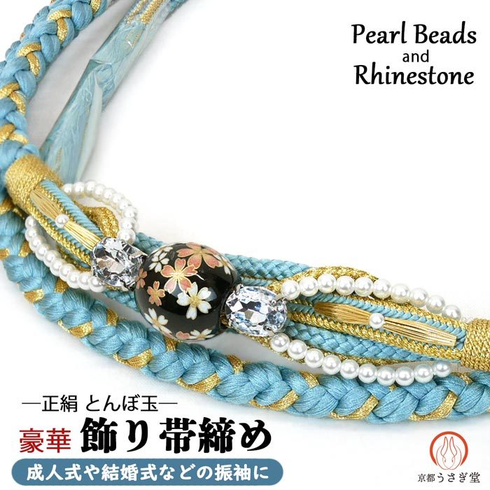 > 帯締め 正絹 振袖用 成人式 oj-092 白 水色 スカイブルー 振袖 結婚式 絹 シルク パールビーズ ラインストーン 紐細工 モダン