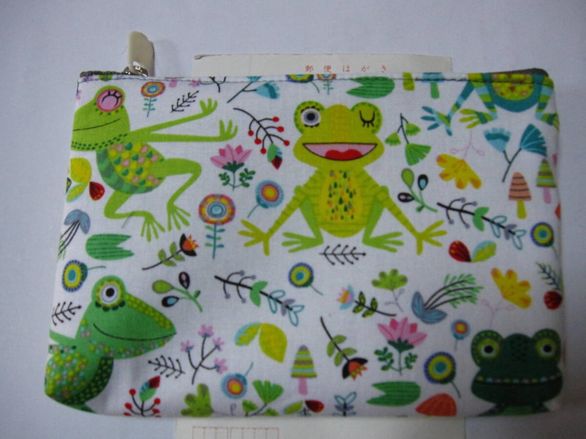 > 手作り 大 ポーチ モダン カエル 花 きのこ 絵柄 模様 ユニーク ハンドメイド 財布 小物 眼鏡 男女 兼用 可愛 お洒落 綿 白×カラフル 幅広