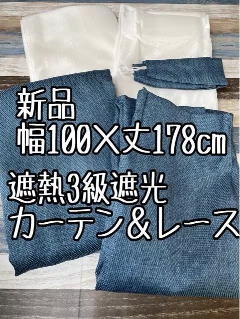 - 新品☆幅100×丈178cmブルー系シンプルおしゃれ遮熱カーテン&レース☆t744