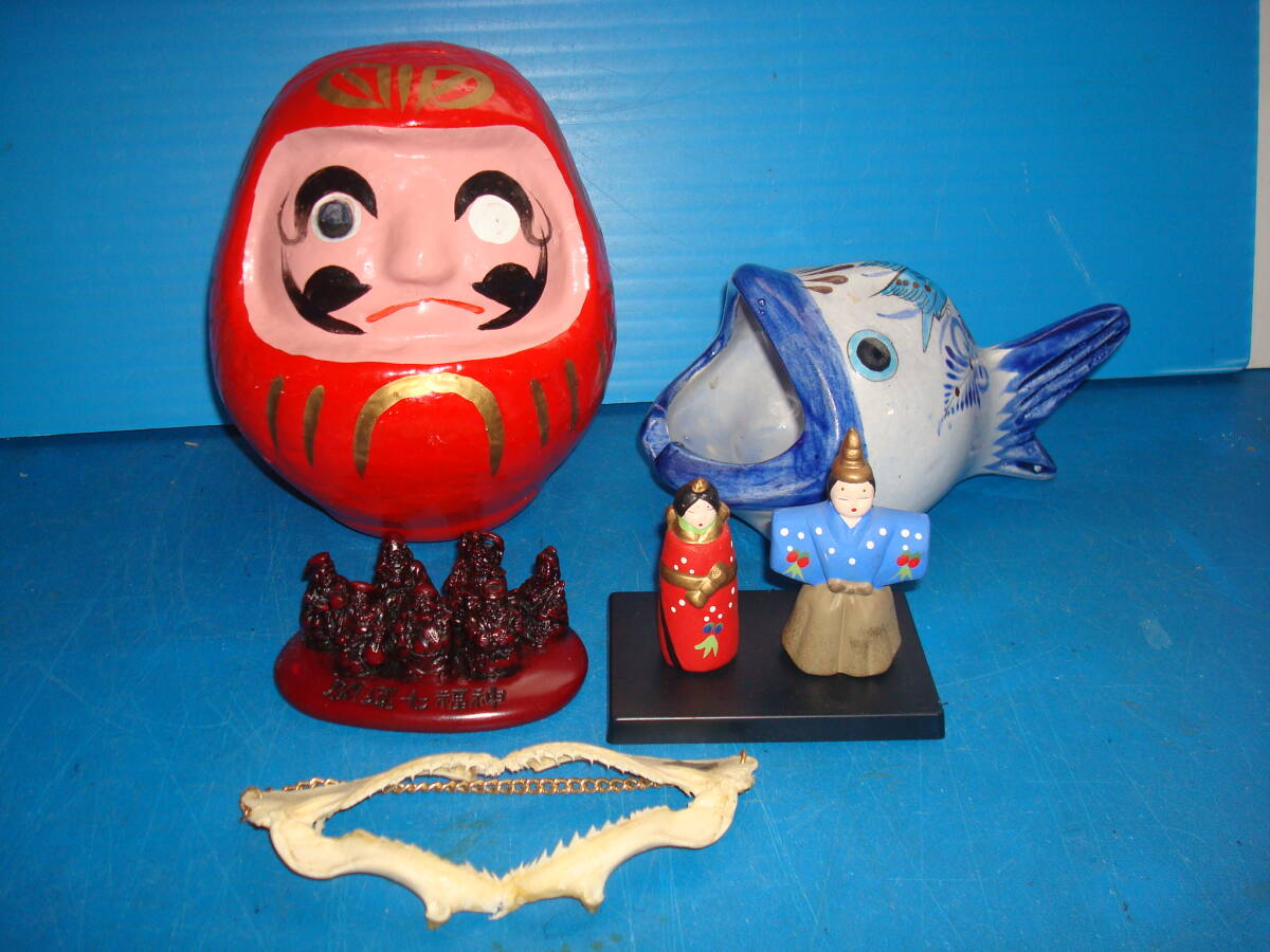- サメの歯(魔除け)、ダルマ、魚の灰皿(小物入れ)、七福神、京ビナ 5点 SDFN5