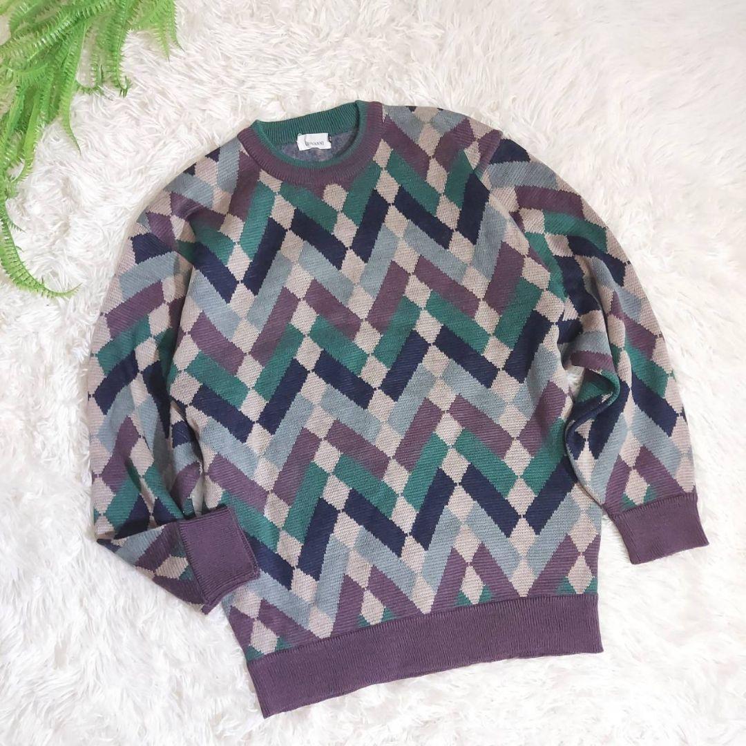 - GIOVANNI 幾何学パターン総柄・ウール混アクリルニット 裏起毛 紫が強めの小豆色&緑&くすんだ水色&ネイビー&グレー 五点で送料無料 66964
