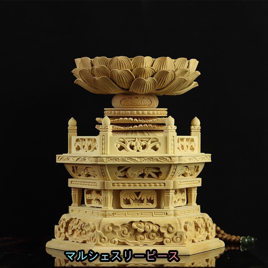 - 六角仏像台 高級天然ツゲ木彫り ◆仏壇用の仏具・仏像をのせる台・仏像置台・仏台【仏教美術品 木彫り 置物】 (高さ15cm×内径8.5cm)