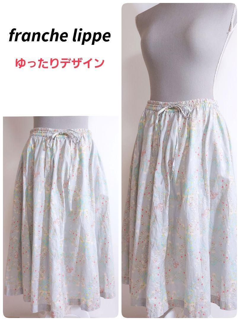 > franchelippe メルヘン風フラワー柄 ミモレ丈スカート 薄い水色 花柄 リス動物アニマル 総柄 81123