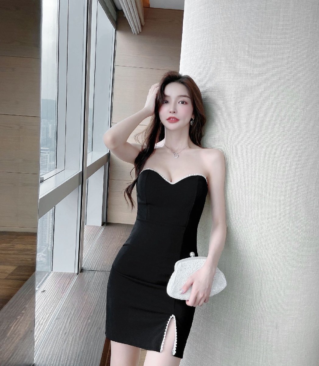 - 新品 セクシー エロかわ ぴったりボディライン 良質 とろみ素材 パール付 スリット入 オフショル 肩開き タイトワンピース LA1418