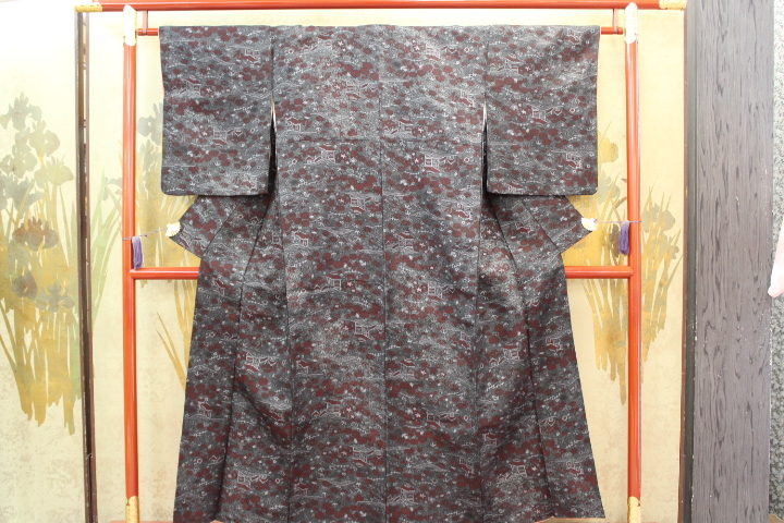 > きもの今昔6791 小紋のきもの 広衿袷手縫い仕立 正絹型打ち染 濃いグレー地に母屋に草花柄 身丈149cm