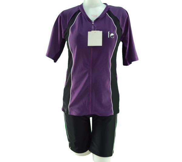 - レディース水着 2点セット フィットネス Fe 袖付き ボディカバー & 補正 半袖 ボトムス 体型カバー L パープル