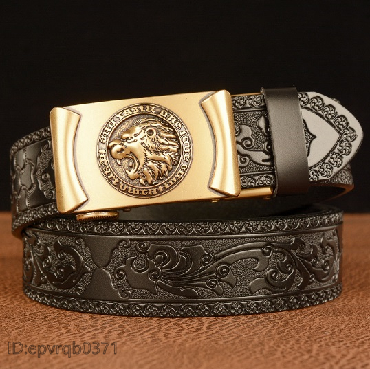 - レザーベルト 新品 オートロック式 バックル ライオン 本革 柄物 メンズベ ルト 幅3.5センチ 紳士 長さ調整可能 2色選ぶ/黒