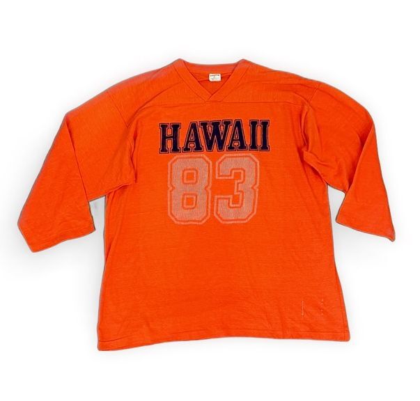 - 70's 80's 米国製 ロゴセブン LOGO7 ビンテージ Tシャツ フットボール HAWAII 83 フロッキー オレンジ L [ta-1023]