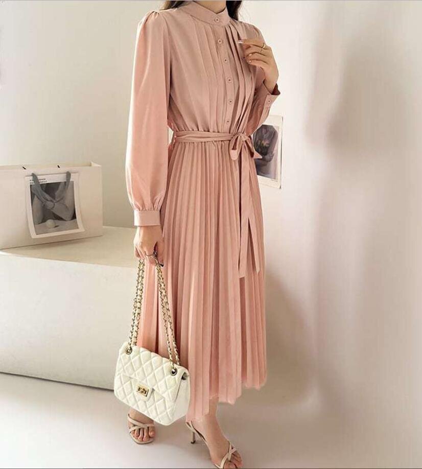 - LB248 長袖 ワンピース プリーツ プリーツワンピース 春 秋 マキシ ロングワンピース きれいめ ウエストリボン付き シフォン ピンク