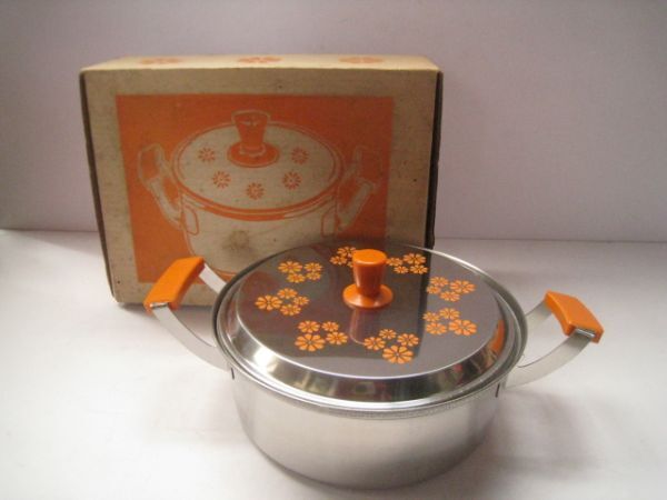 - 未使用 レトロ 花びら ステンレススチール ソースポット22㎝ オレンジの花柄 難あり /22N4.4-13