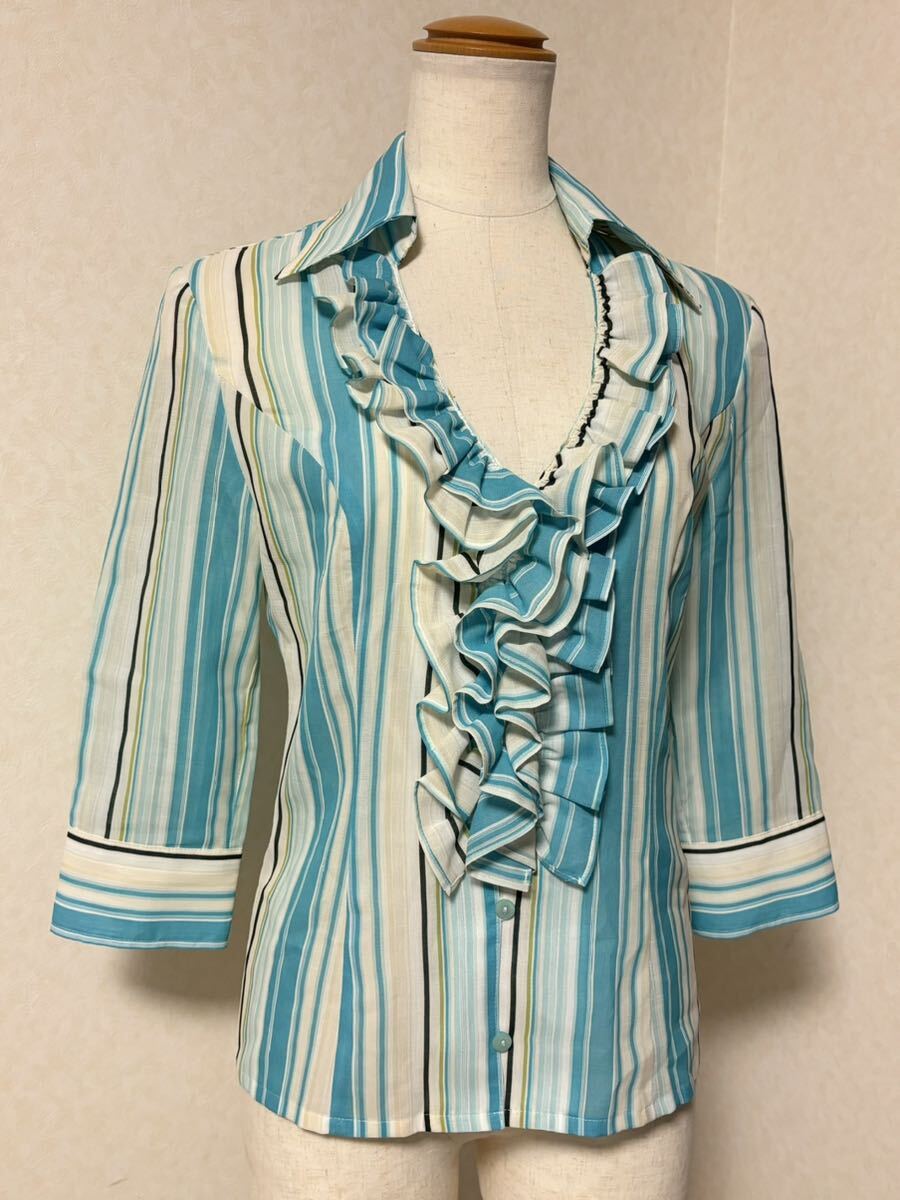 > ■ CDEC クードシャンス 日本製 レディース 薄手 7分袖 ブラウス シャツ トップス カットソー Mサイズ 38号 ホワイト ブルー ストライプ柄
