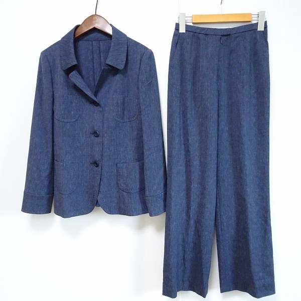 > #snc レリアン Leilian パンツスーツ セットアップ ツーピース 9 紺 麻混 ステッチ 薄手 シンプル 無地 レディース [875347]