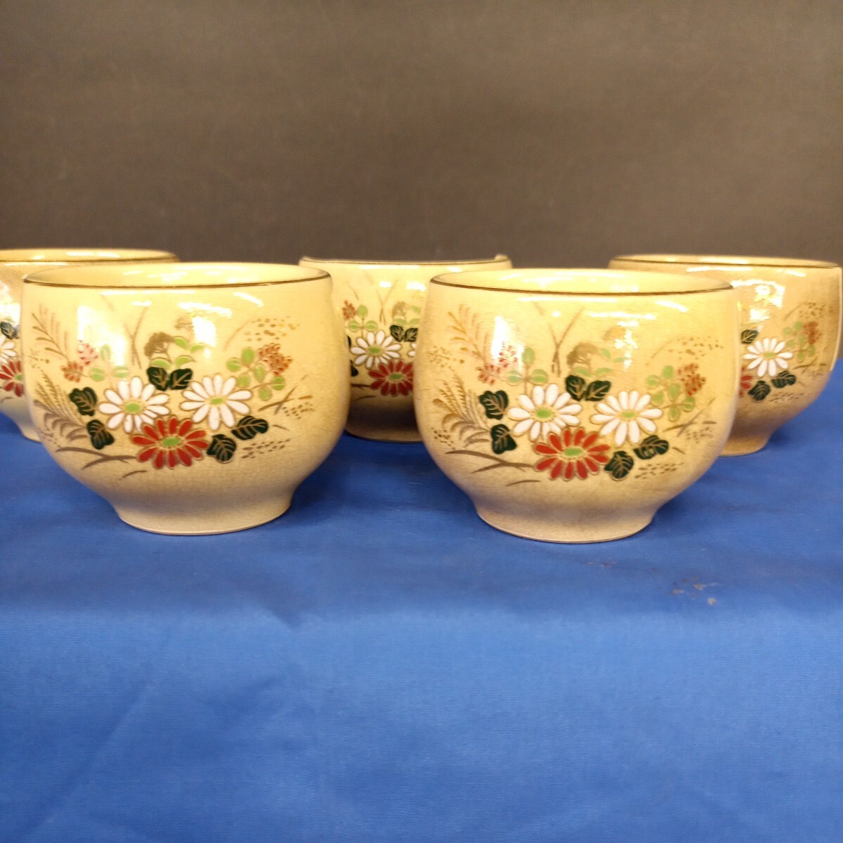 - 昭和レトロ■薩摩焼 湯呑み 秋草 金彩 玉湯のみ 5客
