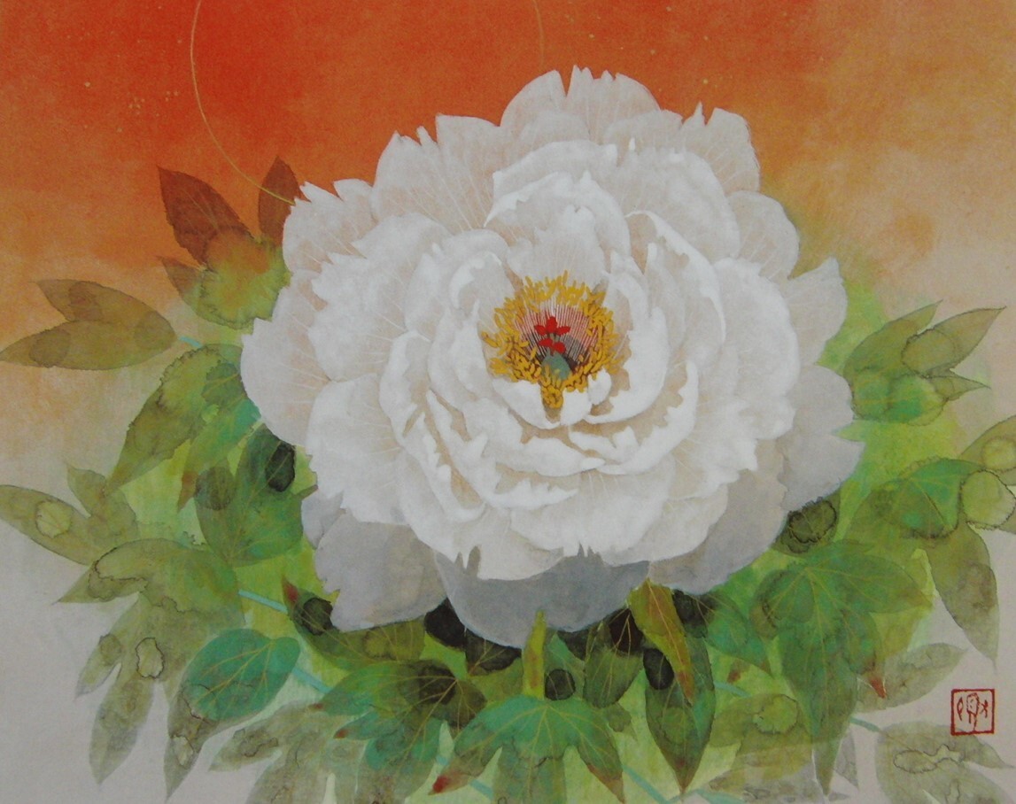 - 中村賢次、【白牡丹】、希少な額装用画集より、厳選、新品額装、マット額装付、状態良好、送料込み