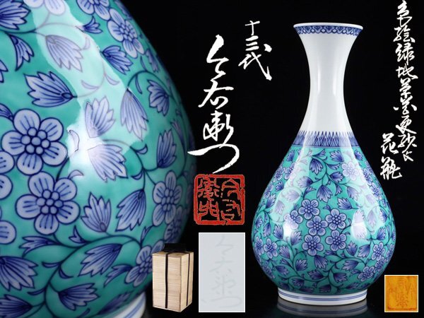 - 魁◆百貨店個展作品 本物保証 人間国宝 十三代今泉今右衛門 秀逸本人作 色鍋島緑地草花更紗文花瓶 共箱付 本人陰刻銘 高さ30.5㎝ 優美作