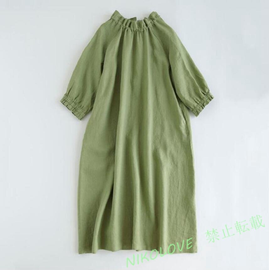 > LC155 春夏 ナチュラル ゆったり 無地 綿麻リネン 大きいサイズ 20304050代 七分袖 ロングワンピース 緑/XLサイズ