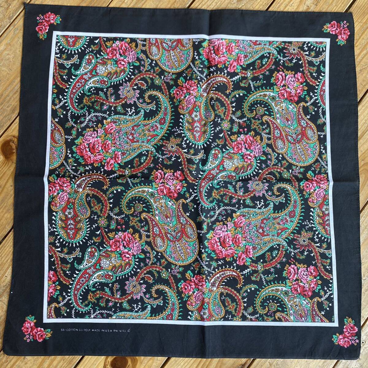 - 送料無料 Vintage ペイズリー柄 バンダナ アメリカ仕入れ 雑貨 おしゃれ 小物 ブラック 黒 花柄 ハンカチ ヴィンテージ A1044