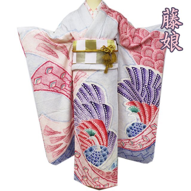 > 振袖 襦袢 2点 セット 着物 中古 きぬたや 藤娘 絞り染め 孔雀 赤系色 青系色 多色 身丈165cm 裄65cm L トール きもの北條 A1013-1
