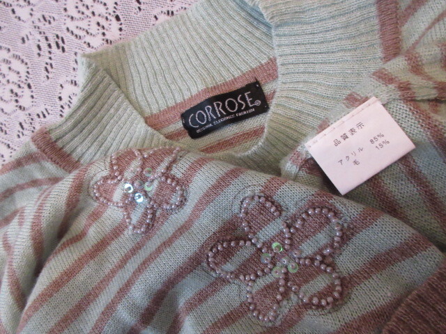> O)■【CORROSE】■手洗い可/毛15%アクリル■ボトルネック/2枚重ね6個のお花に刺繍&ビーズ!優しいお色合いボダーセーター■MLサイズ