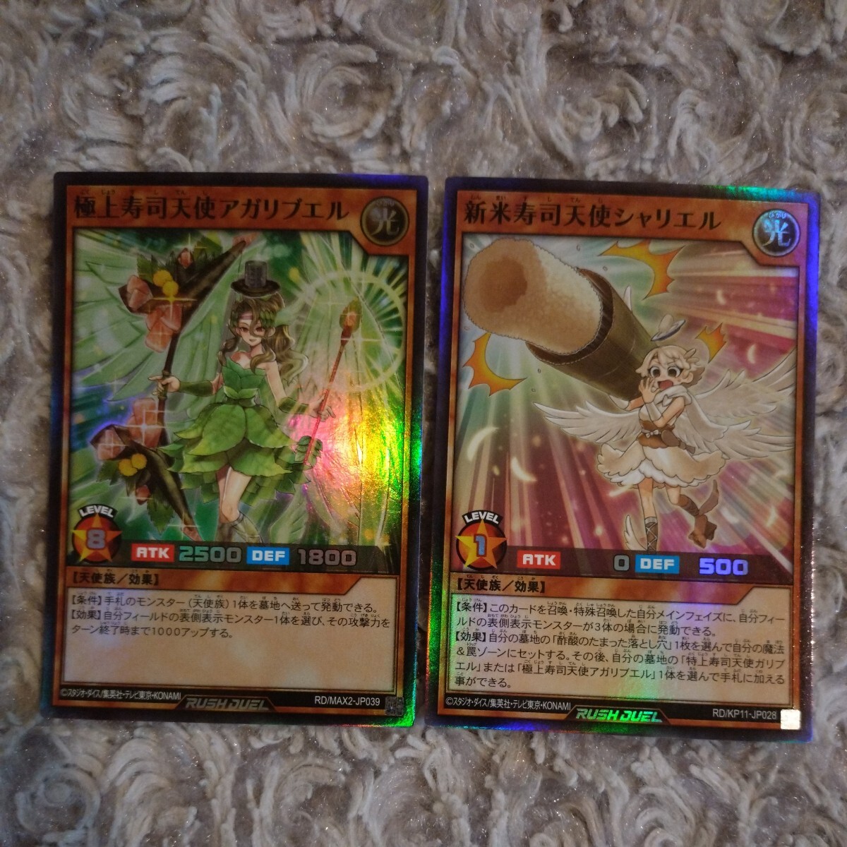 - 遊戯王 RUSH DUEL ☆ 寿司天使 SR 2枚セット ☆ 極上寿司天使アガリブエル 新米寿司天使シャリエル スーパーレア ホイル加工 ☆ 光 天使族