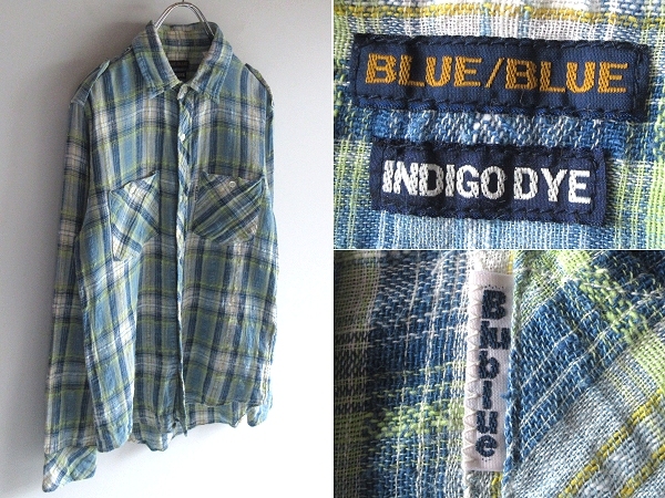 - BLUE BLUE ブルーブルー INDIGO DYE ロゴピスネーム コットンリネンガーゼ チェックシャツ 1/S インディゴ ライトグリーン ネコポス対応