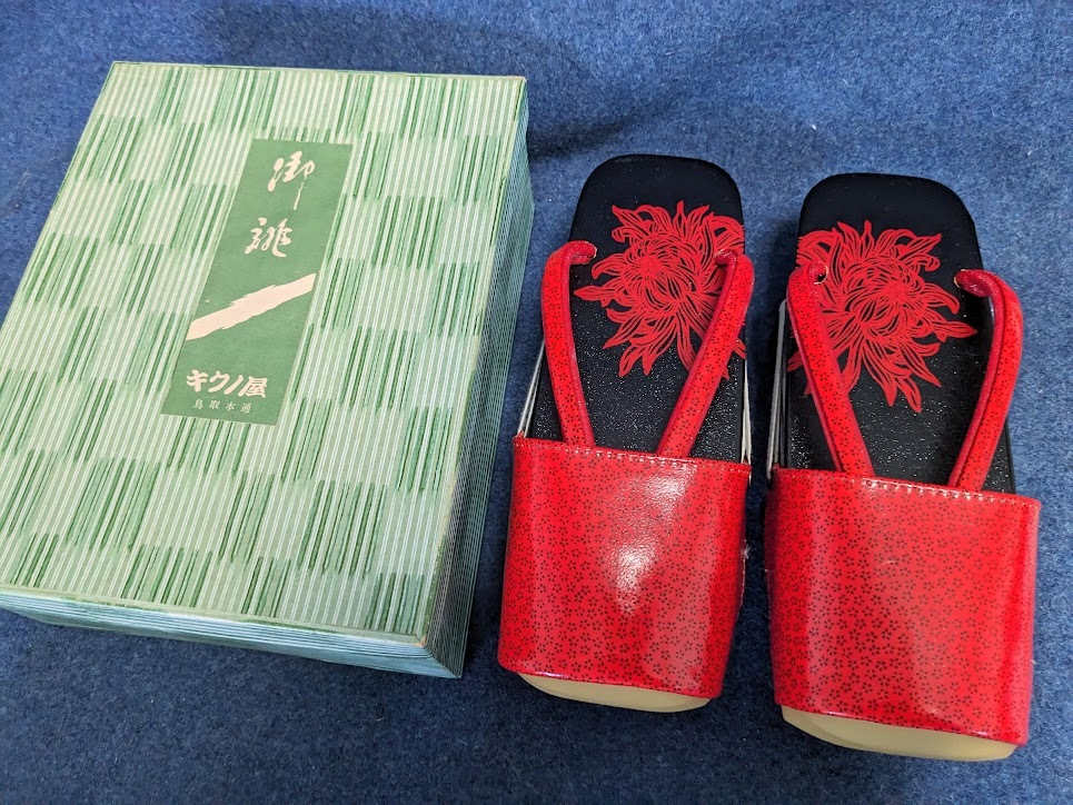 > 未使用★【女性 和装下駄】箱入り赤色 雨除け カバー付き サイズ約23㎝ キクノ屋 鳥取本通り