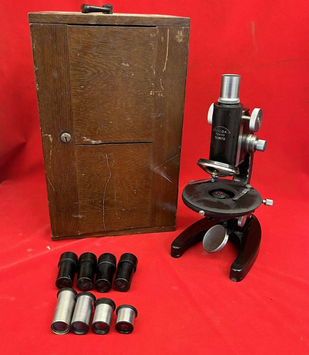 > ★TIYODA TOKYO★顕微鏡★木箱付★B★対物レンズ3/10 0.30/40 0.17 0.65/HI 90 1.25★接眼5X/7X/10X/15X★レトロ★研究★千代田★SR(P623)