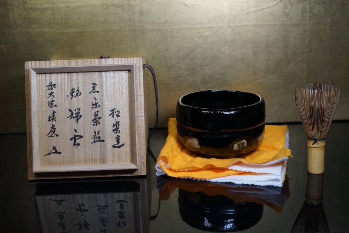 > 佐々木松楽 黒楽茶碗 書付 【銘 瑞雲】前大徳寺 福本積應 花押 箱書付有 在銘 松楽 共箱 桐四方桟 共布 茶道具 93H-D-2