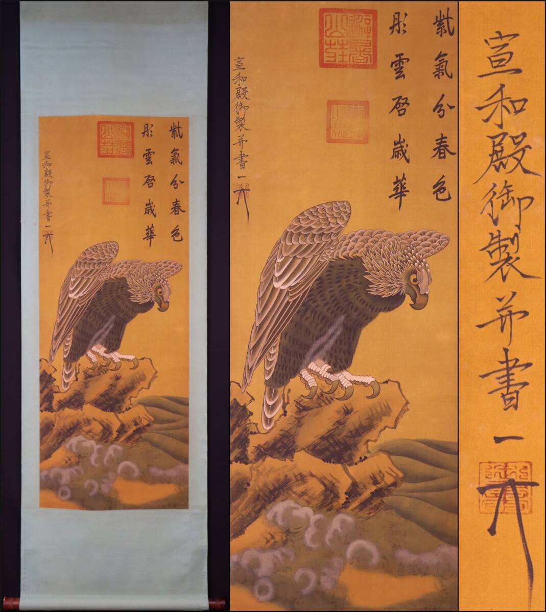- 古美術 掛け軸 中国・宋時代 「宋徽宗書」 絹本 【鷹石図】 立軸 書道 巻き物 真筆逸品 肉筆保証 唐物 古画 LT-24600