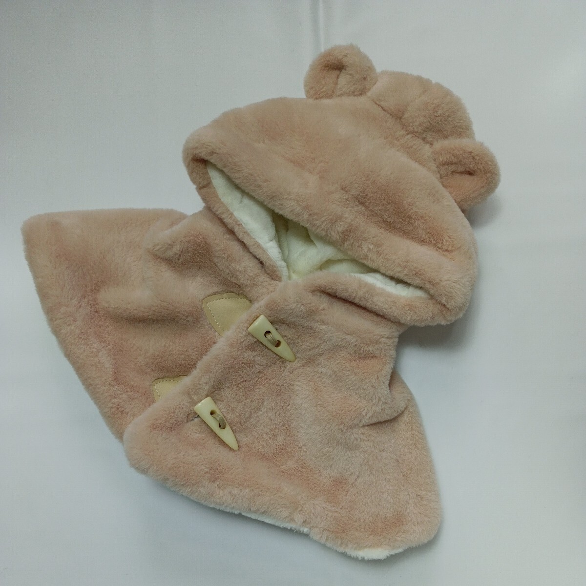 - 【キャメル】【未使用】ベビー 赤ちゃん 男の子 女の子 帽子 防寒 ぽんちょ ポンチョ クマ耳 耳付き もこもこ あったか シンプル 無地 ②