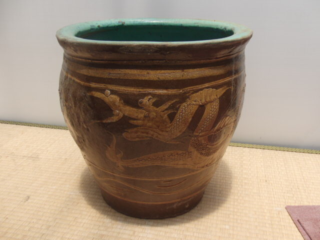 - ◆中国陶磁器 双龍戯球 ピータン壺/甕◆宜興焼 ピータン甕 大きい金魚鉢 メダカ 植木鉢カバー 盆栽 Φ44xH43cm④◆USED 管-舗1