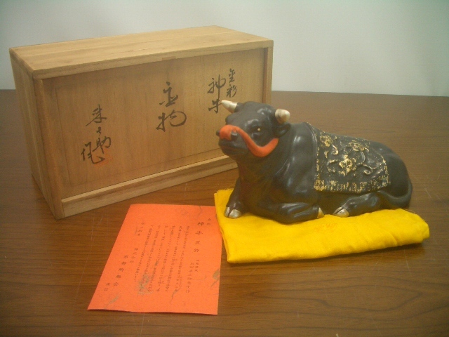 - ◆京都陶雅会 陶彫権威 石田来之助 金彩 神牛 置物 木箱付