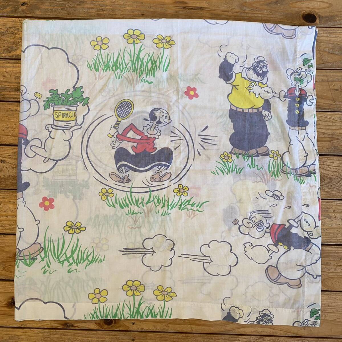 - USAヴィンテージ ベッドシーツ ポパイ リメイク生地 素材 フラットシーツ アメコミ ほうれん草 水兵 船乗り オリーブ アメリカ仕入 B2230