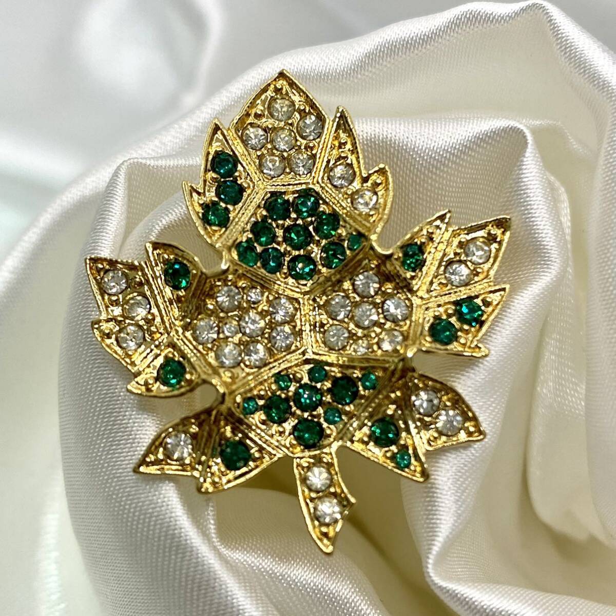 > リーフ 葉 ブローチ ラインストーン × ゴールド系 ヴィンテージ vintage ビンテージ アンティーク アクセサリー 装飾品 刻印有