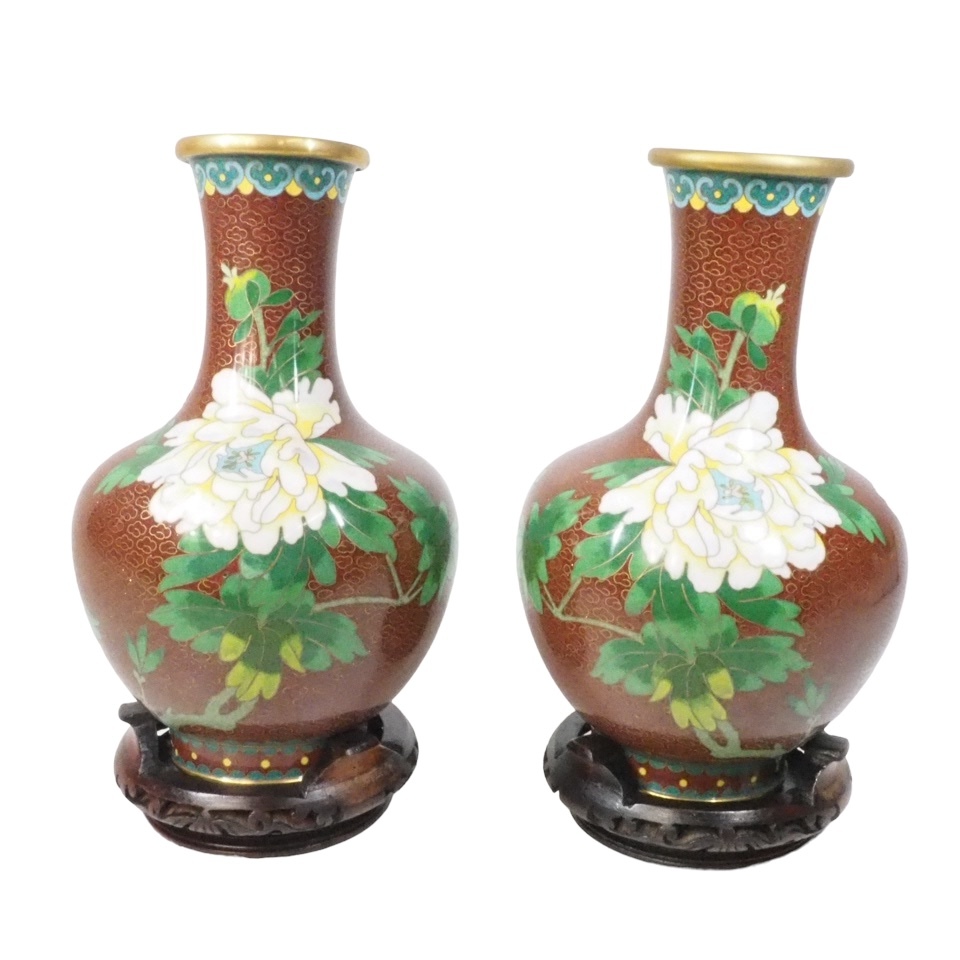- 中国古玩 中国美術 景泰藍「有線七宝花図双対花瓶」台付 茶色 花器 壷 1970〜1980年代 SMG606