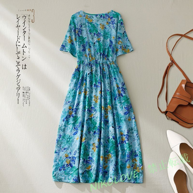 - 新品ゆったり大きいサイズ カジュアル 身を修めてやせて見える 丸首 ちいさな花柄 半袖 ワンピース 青 LE893