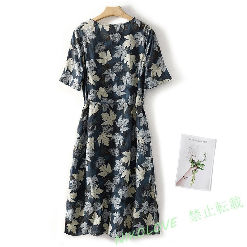 - 新品カジュアル ゆったりサイズ 身を修めてやせて見 軽薄 木の葉 Vネック 半袖ワンピース ネイビー LH236