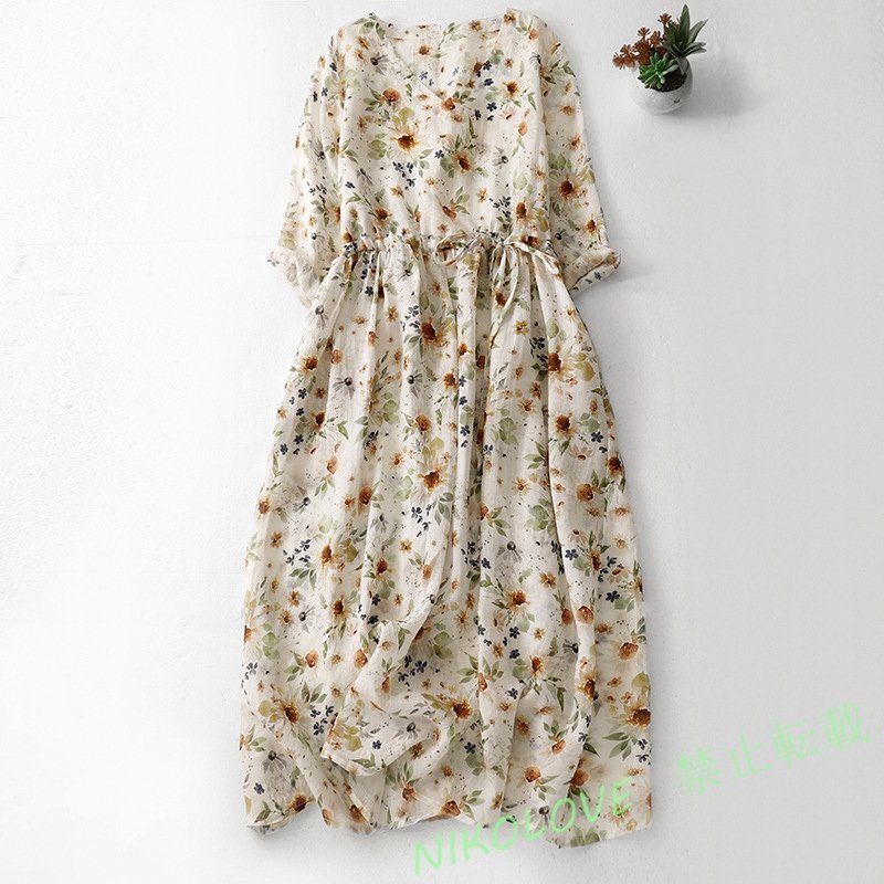 - 新品オシャレ 花柄 ワンピース 半袖 きれいめ ロングワンピース 大人可愛い プリント柄 ミモレ丈 ワンピース グリーン LH432
