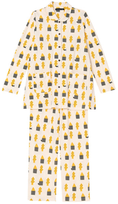 - マタノアツコ★ワコール★前開き襟付き 長袖パジャマ★Lサイズ★迷子になっている黒猫★綿100%強撚天竺素材★アイボリーxイエロー/俣野温子