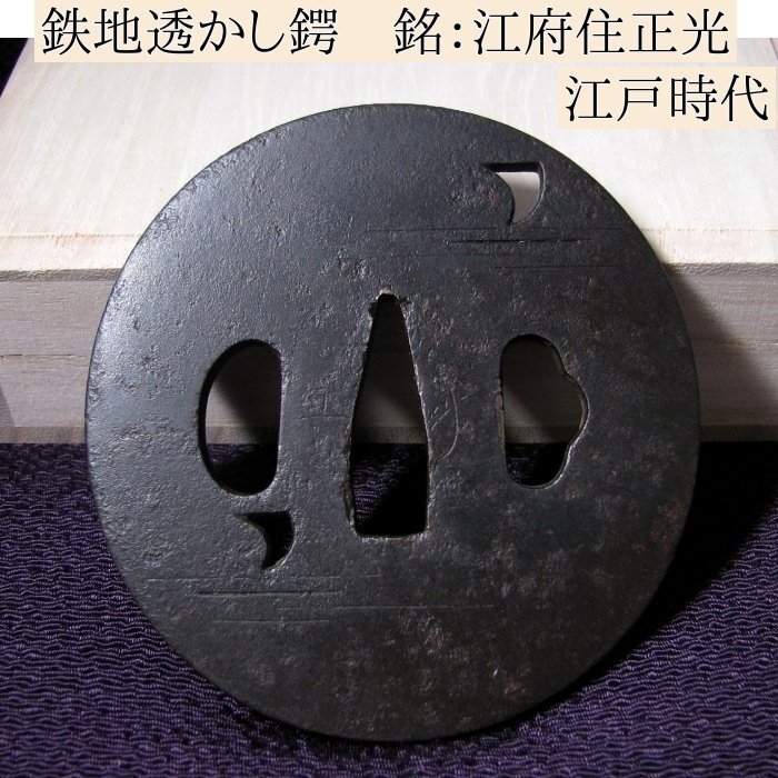 - 時代武具 鉄地透かし鍔 [銘:江府住正光] 桐箱付 江戸時代/鐔/24f005